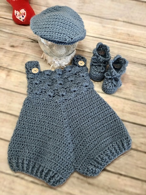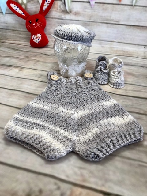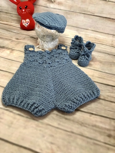 Set comprises of jumpsuit, booties and a beautiful peaky blinders cap.